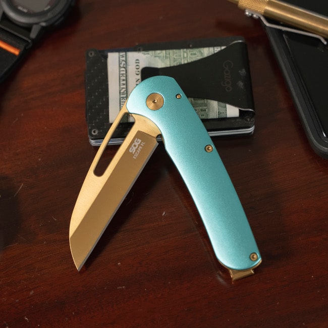Sometimes a simple, honest knife with a SOG sharp blade is just the trick. This update to our popular Escape FL frame lock folder boasts a 3" 440C blade with a gold finish that contrasts nicely with the eye-catching red handle.